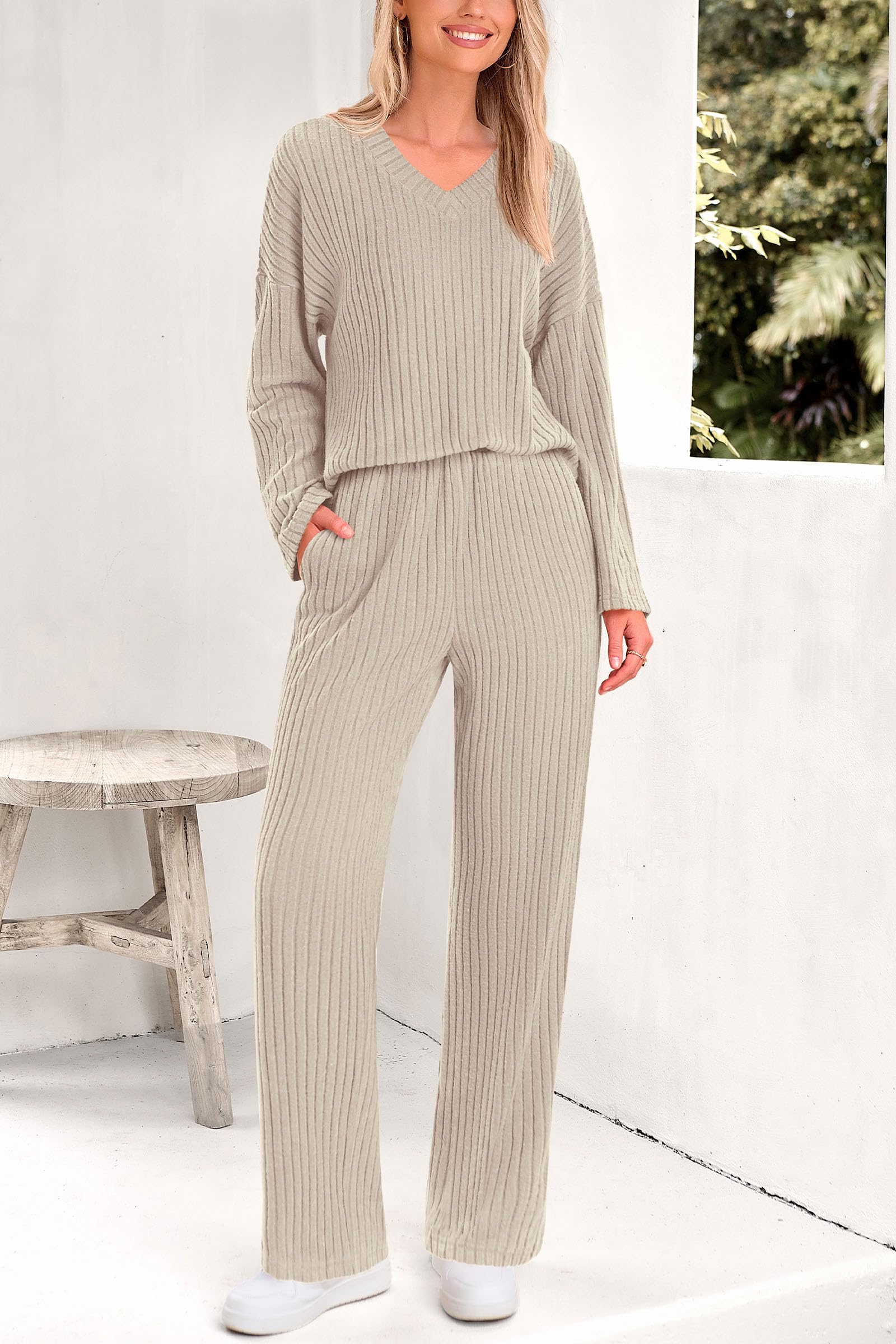- FEATURES: Two Piece Sets for Women; Matching Sets Women Clothing; Womens Long Sleeve Tops; Wide Leg Pants Woman with Pockets; Lounge Sets; Womens Pajama Sets; V Neck T Shirts; Elastic Waist Comfy Pants; Pants Sets Women 2 Piece Outfits; Spring Break Outfits
