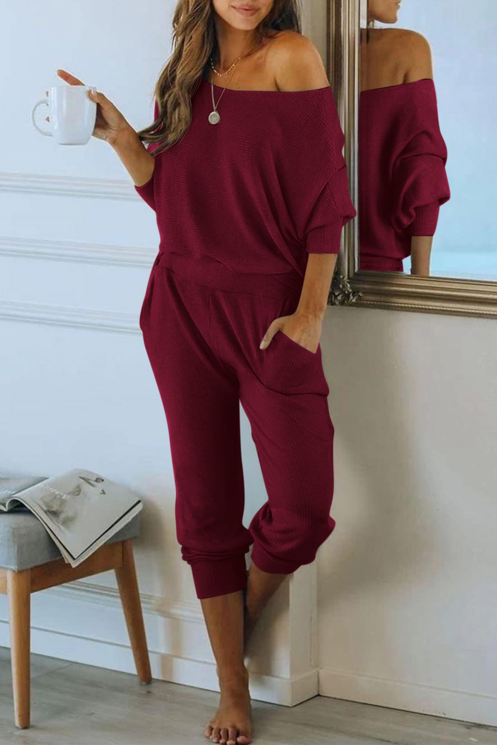 - Styling Options: Effortlessly pair this matching set with sneakers, sandals, or heels. Wear it complete as a cozy lounge set, or separate the pieces: style the off-shoulder top with jeans, or the pants with a casual tee for versatile, everyday looks