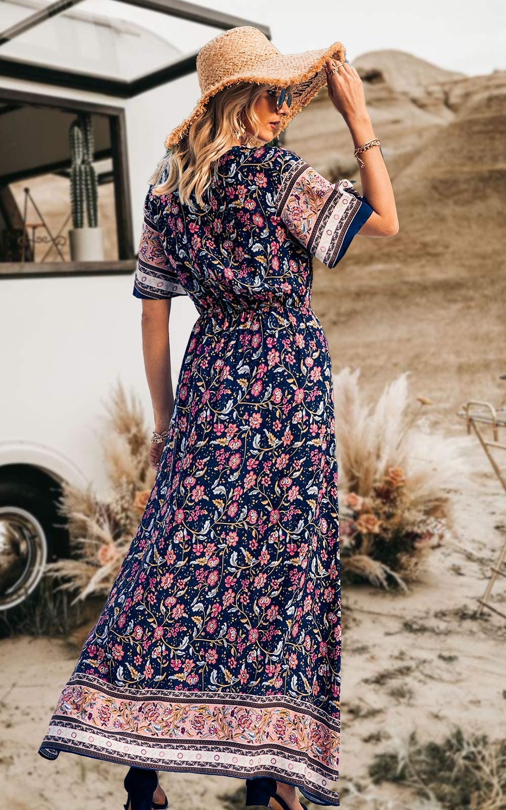 - Unique Designs: Deep V Neck Dress/ Summer Maxi Dresses/ Long Boho Dresses For Women/ Short Sleeve Dress/ Vintage Floral Print Dress/ Empire Waist Dresses For Women/ Bohemian Beach Dress/ Flowy Ruffle Hem Dress