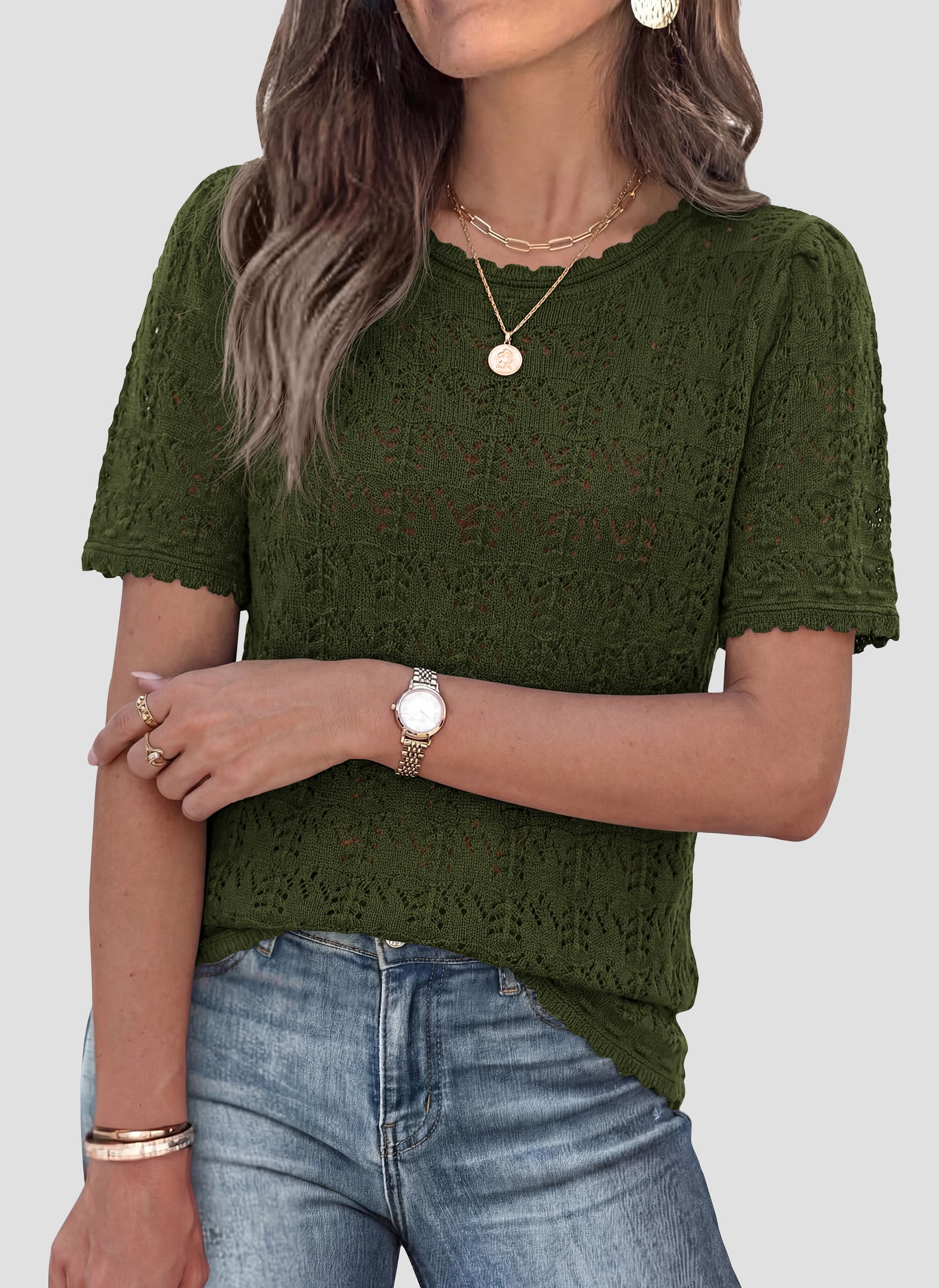 - Feature: Summer tops for women is features with unique fan shape edge round neck, sleeve and hem; crochet tops; casual loose; hollow out spring tops, short sleeve sweaters for women lightweight; boutique tops for women; business causal tops.It's a versatile summer tops